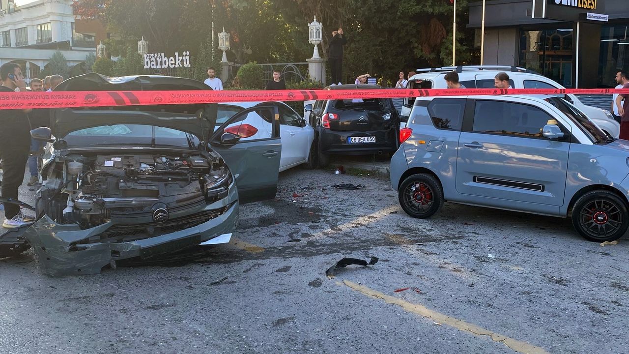 Sakarya'nın Serdivan ilçesinde, dörtlülerini yakarak yol kenarındaki bir işletmeye gitmek için sağ şeritte duran bir otomobile beton mikseri çarptı. Çarpmanın şiddetiyle sürüklenen otomobil, park halindeki dört araca daha çarptı.