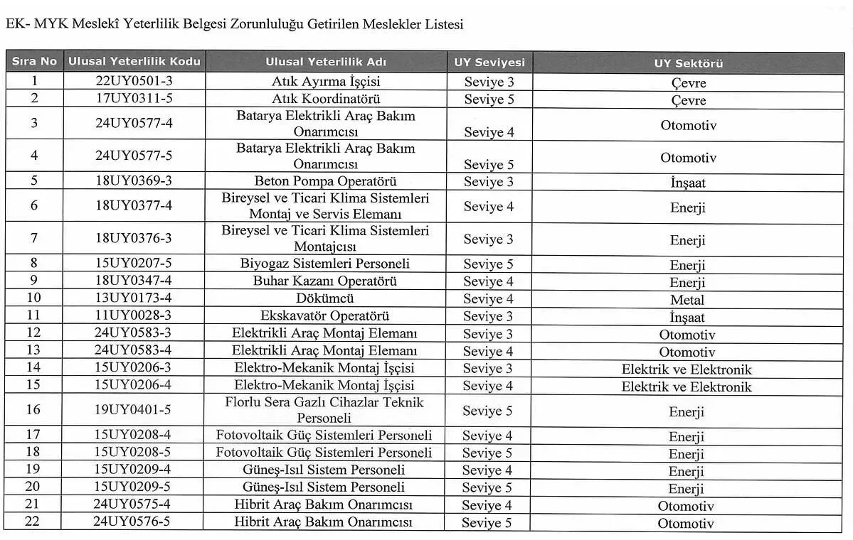 Bu kapsamda zorunluluk getirilen meslekler; enerji, otomotiv, inşaat, maden, çevre ve makine gibi farklı sektörleri kapsayan geniş bir yelpazeye yayılıyor. Listede atık ayırma işçisi ve atık koordinatöründen, elektrikli ve hibrit araç bakım onarımcısına; beton pompa ve ekskavatör operatörlerinden, klima ve fotovoltaik sistem personeline kadar birçok meslek yer alıyor.
