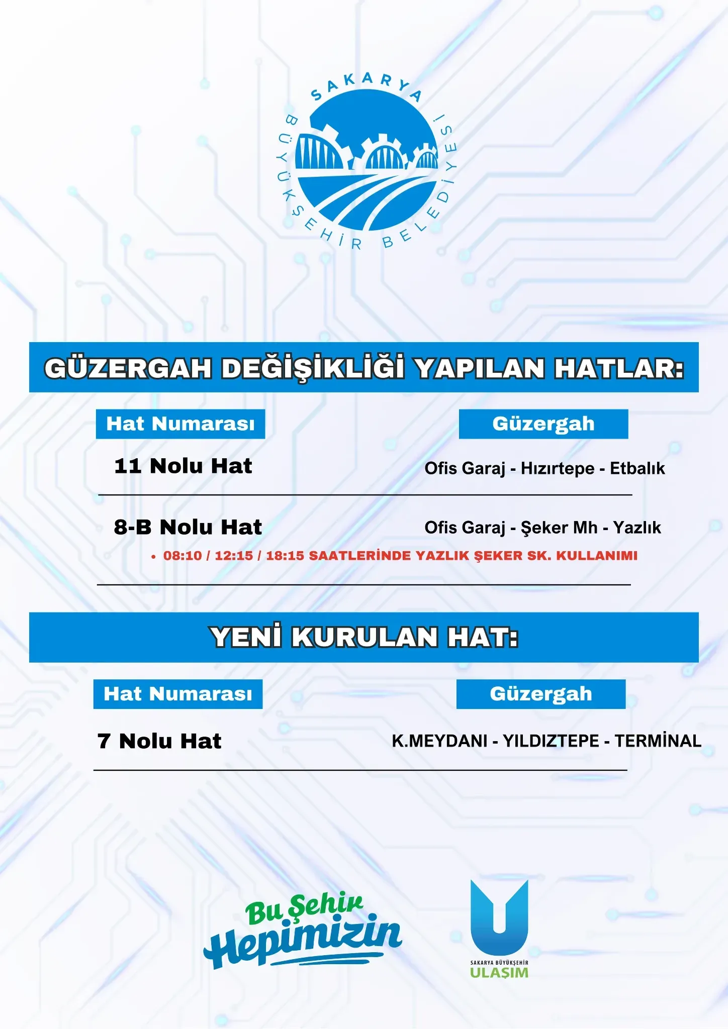 Sakarya Büyükşehir Belediyesi, vatandaşlardan gelen yoğun talepleri dikkate alarak toplu taşıma hatlarının güzergah ve saatlerinde yeni düzenlemeler yaptı. Yapılan bu değişiklikler, 17 Kasım Pazartesi gününden itibaren geçerli olacak.