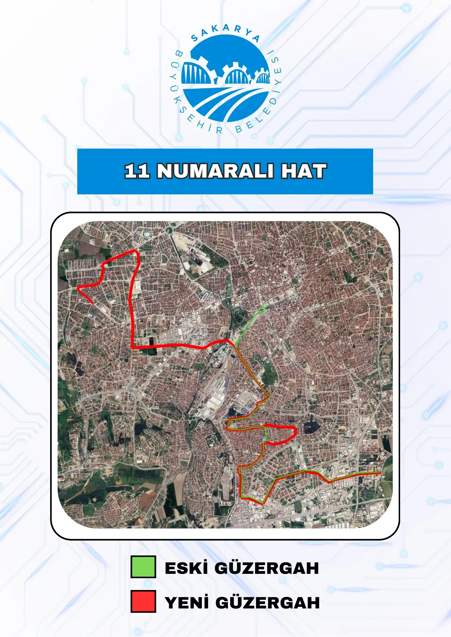 '11' numaralı Ofis Garaj-Hızırtepe-Et Balık hattının güzergahı, vatandaş talebi doğrultusunda Serdivan'ın Yazlık bölgesine kadar uzatıldı.