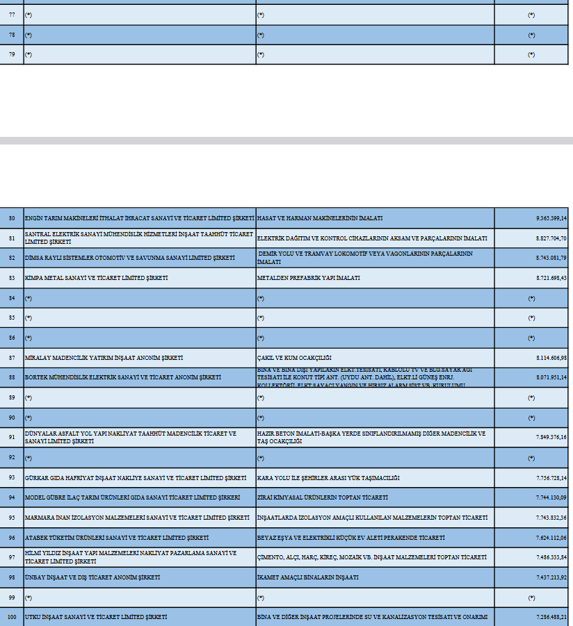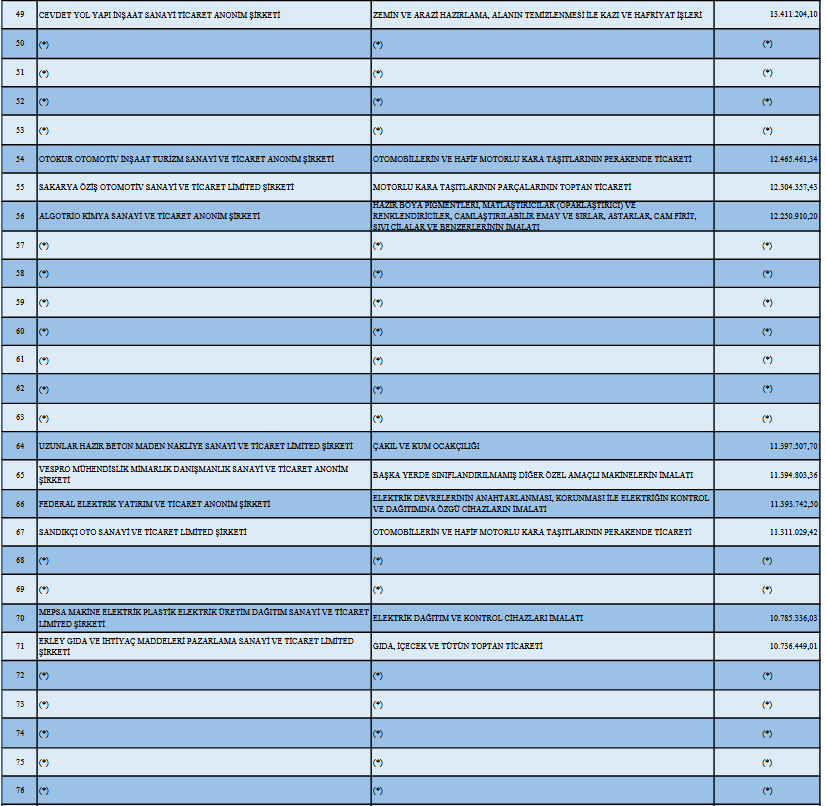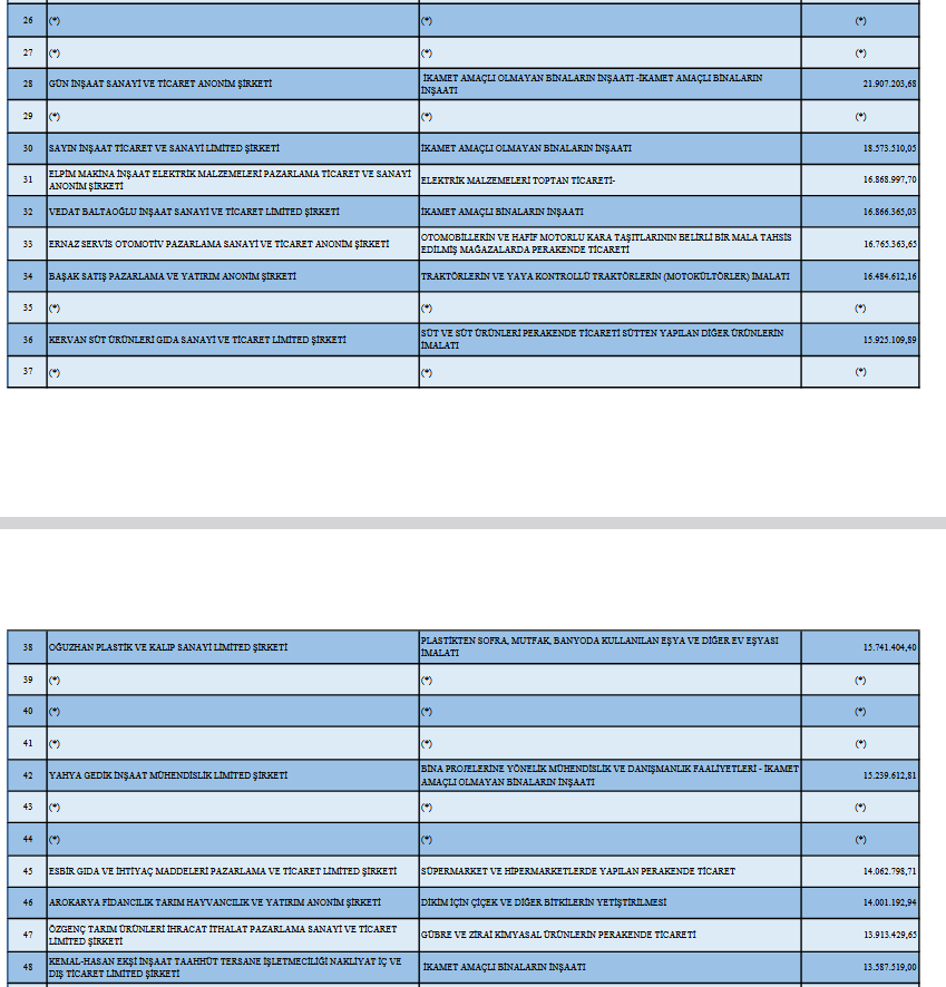 Listenin devamında, bazı kurumların isimleri açıklanmazken, ilk 100'e giren diğer büyük şirketler arasında Oğuz İçecek Gıda Sanayi A.Ş. (83,1 milyon TL) ve Schmitz Cargobull Treyler Sanayi Ltd. Şti. (82,8 milyon TL) dikkat çekti.
