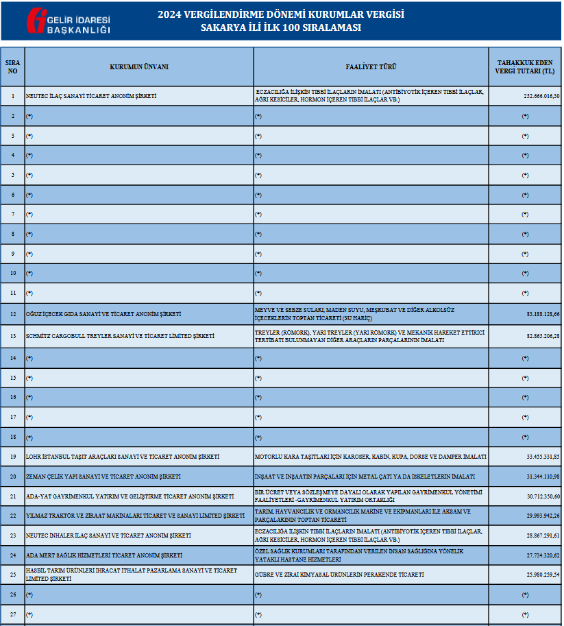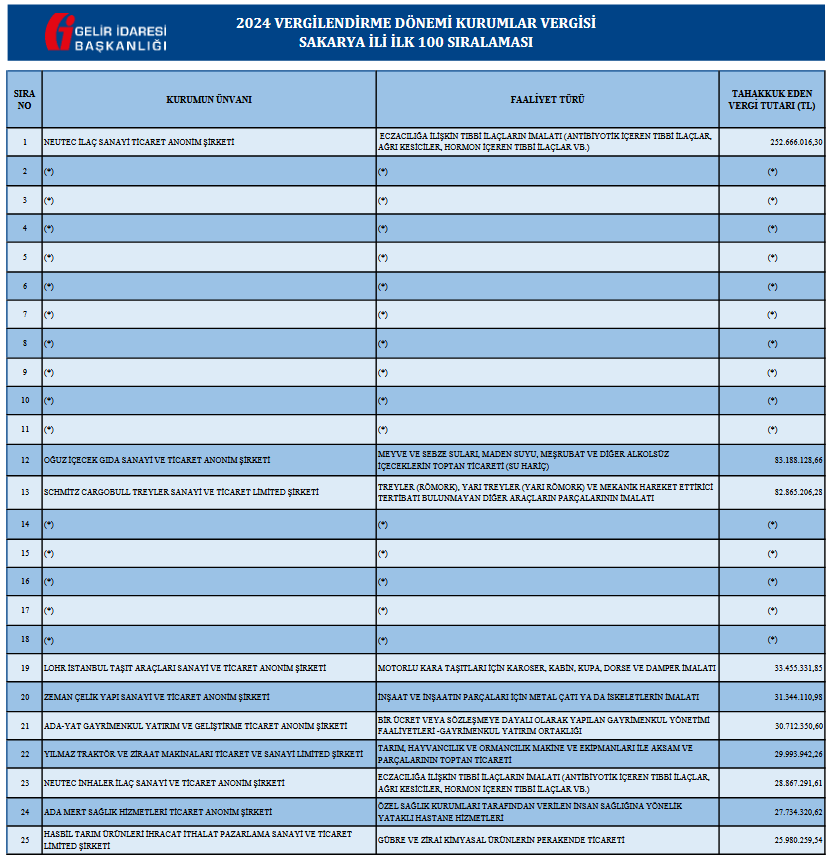 2024 yılına ilişkin yıllık gelir ve kurumlar vergisi beyannamelerinin değerlendirilmesi sonucunda, Sakarya'da en fazla vergi beyan eden ilk 100 mükellef belirlendi.