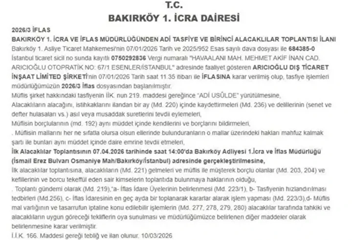 Artan maliyetler ve nakit akışındaki bozulma nedeniyle konkordato talebinde bulunan firma için Bakırköy 1. Asliye Ticaret Mahkemesi tarafından nihai iflas kararı alındı.