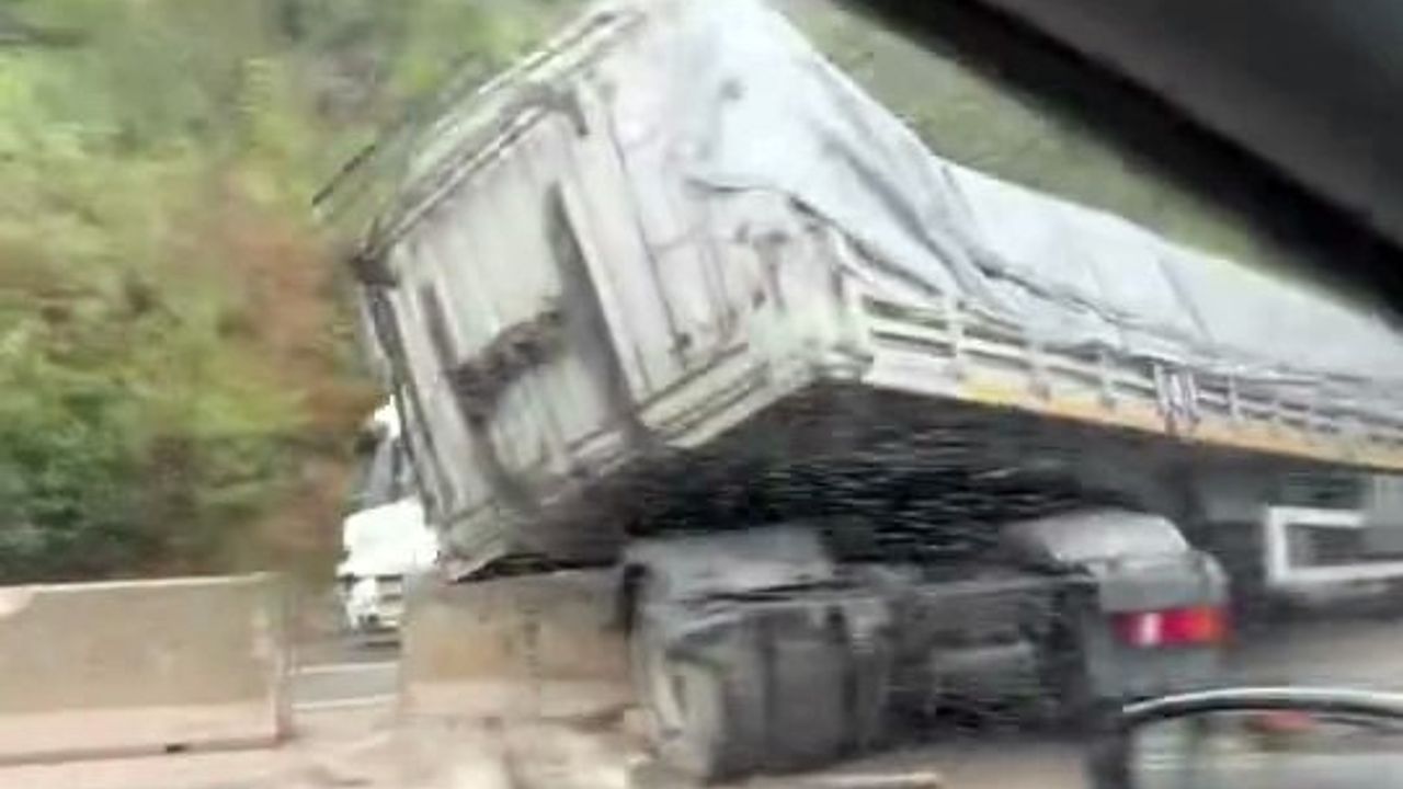 Geyve D-650 kara yolunda yağışın etkisi ile sürücüsünün direksiyon hakimiyetinden çıkan tır, orta refüje çarparak makasladı. Kaza sebebi ile bölgede trafik yoğunluğu oluştu.