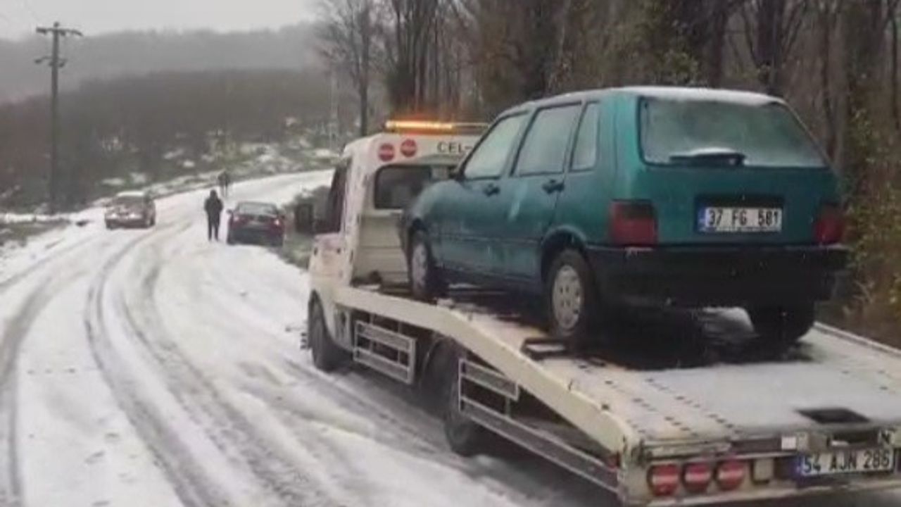 Karasu ilçe merkezinde etkili olan kar yağışı nedeniyle trafikte aksamalar yaşandı. Kar yağışına hazırlıksız yakalanan ve yolda kalan bazı sürücüler, araçlarını kurtarmak için çekici yardımı almak zorunda kaldı.