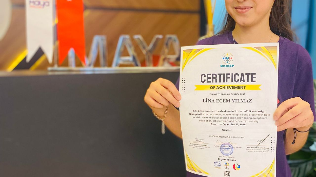 Maya Ortaokulu Sakarya öğrencisi Lina Ecem Yılmaz, UniCEP tarafından düzenlenen Uluslararası Sanat ve Tasarım Olimpiyatlarında Altın Madalya kazanarak önemli bir başarıya imza attı.
