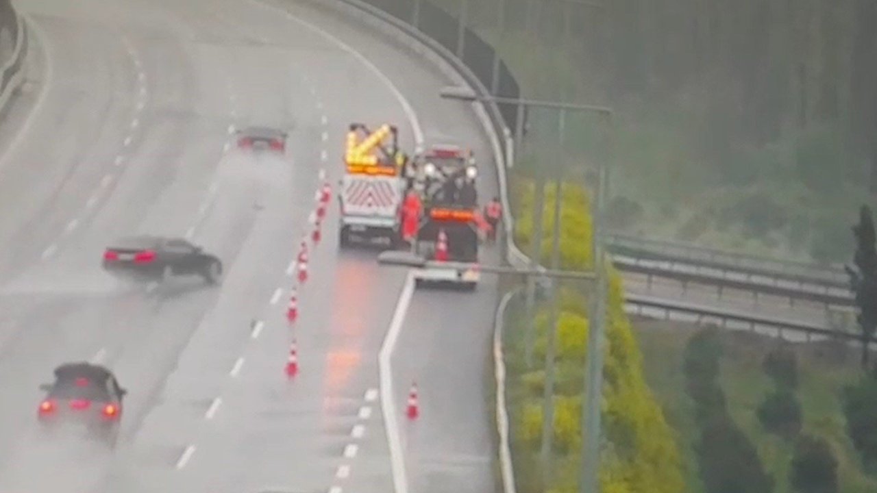 Öte yandan kaza anı güvenlik kamerası tarafından saniye saniye kaydedildi. Görüntülerde, en sol şeritte ilerleyen otomobilin birden kontrolden çıkarak şeritleri enine geçmesi, sağdaki çelik bariyerlere vurduktan sonra savrularak yol kenarında güvenlik önlemi alan çalışanlara çarpması yer alıyor.