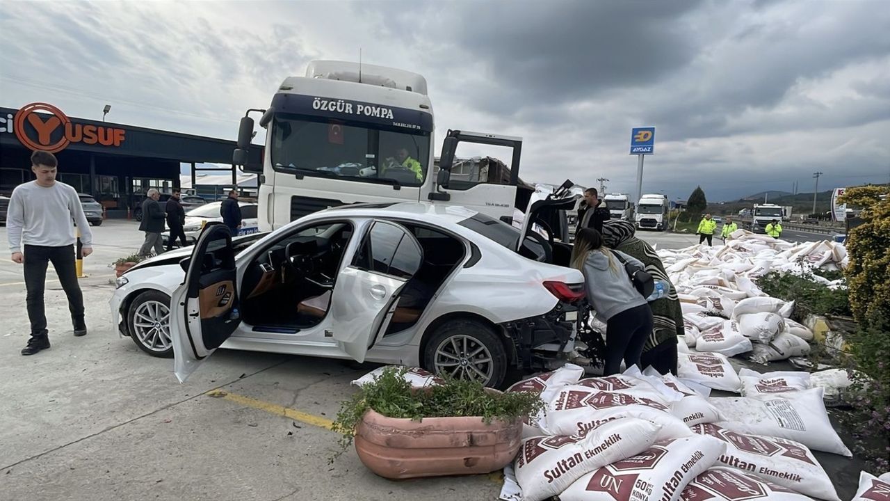 Sakarya’nın Pamukova ilçesinde dün öğle saatlerinde D-650 kara yolu üzerinde yürekleri ağza getiren bir kaza yaşandı. Bilecik’ten Sakarya istikametine seyir halinde olan H.K. idaresindeki 42 GL *** plakalı un yüklü TIR, kendisini solladıktan sonra aniden Turgutlu Mahallesi mevkiindeki bir akaryakıt istasyonuna girmek isteyen İ.K. yönetimindeki 54 TK *** plakalı lüks otomobille çarpıştı.