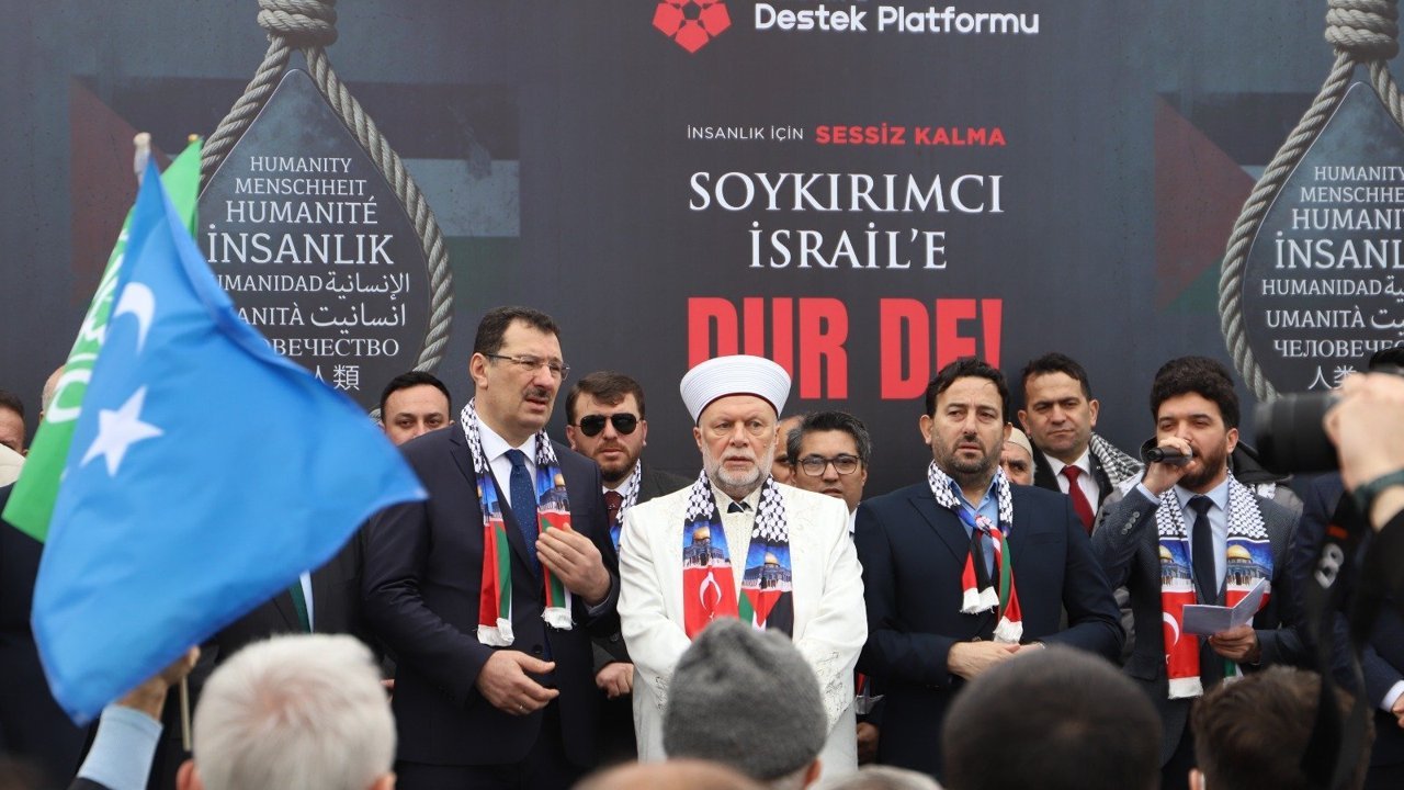 Katılımcılar, ellerindeki dövizler ve sloganlarla Filistin halkının yalnız olmadığını vurgulayarak, bölgede ivedilikle barışın tesis edilmesi gerektiğini belirttiler.