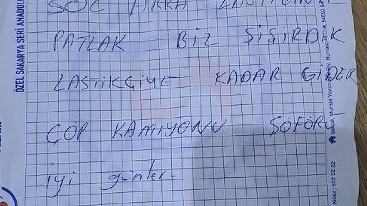 Yazlık Süleyman Binek Caddesinde işe gitmek için evden çıkan bir vatandaş arabasının üzerinde, "Sol arka lastiğiniz patlak. Biz şişirdik. Lastikçiye kadar gider. Çöp kamyonu şoförü. İyi günler" notunu buldu.