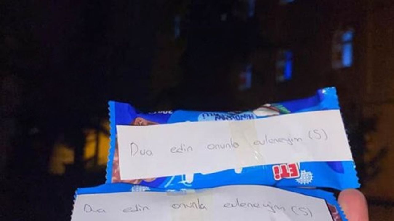 Sakarya’da kandil gecesinde bir genç, yatsı namazı çıkışında cami cemaatine üzerinde anlamlı bir not bulunan çikolatalar dağıttı. Genç tarafından dağıtılan çikolataların üzerinde “Dua edin onunla evleneyim. (S)” yazıyordu.
